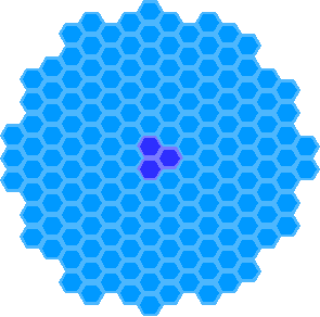 A drawing of 162 hexagonal pixels centered around a point where three pixels meet. I've been experimenting with possible shapes for the Cities: Skylines II playing area, in the event they use hexagonal tiles as some have speculated. There are two "classes" of six hexagons apiece which are (on average) equidistant from the center and which take you from 156 hexagons to 168, but using the one I used (the pairs of hexes sticking out) and not the other one (which would expand those rows of three hexes along the boundary to five hexes) looks nicer in my opinion.