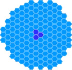 A drawing of 150 hexagonal pixels centered around a point where three pixels meet. I've been experimenting with possible shapes for the Cities: Skylines II playing area, in the event they use hexagonal tiles as some have speculated.