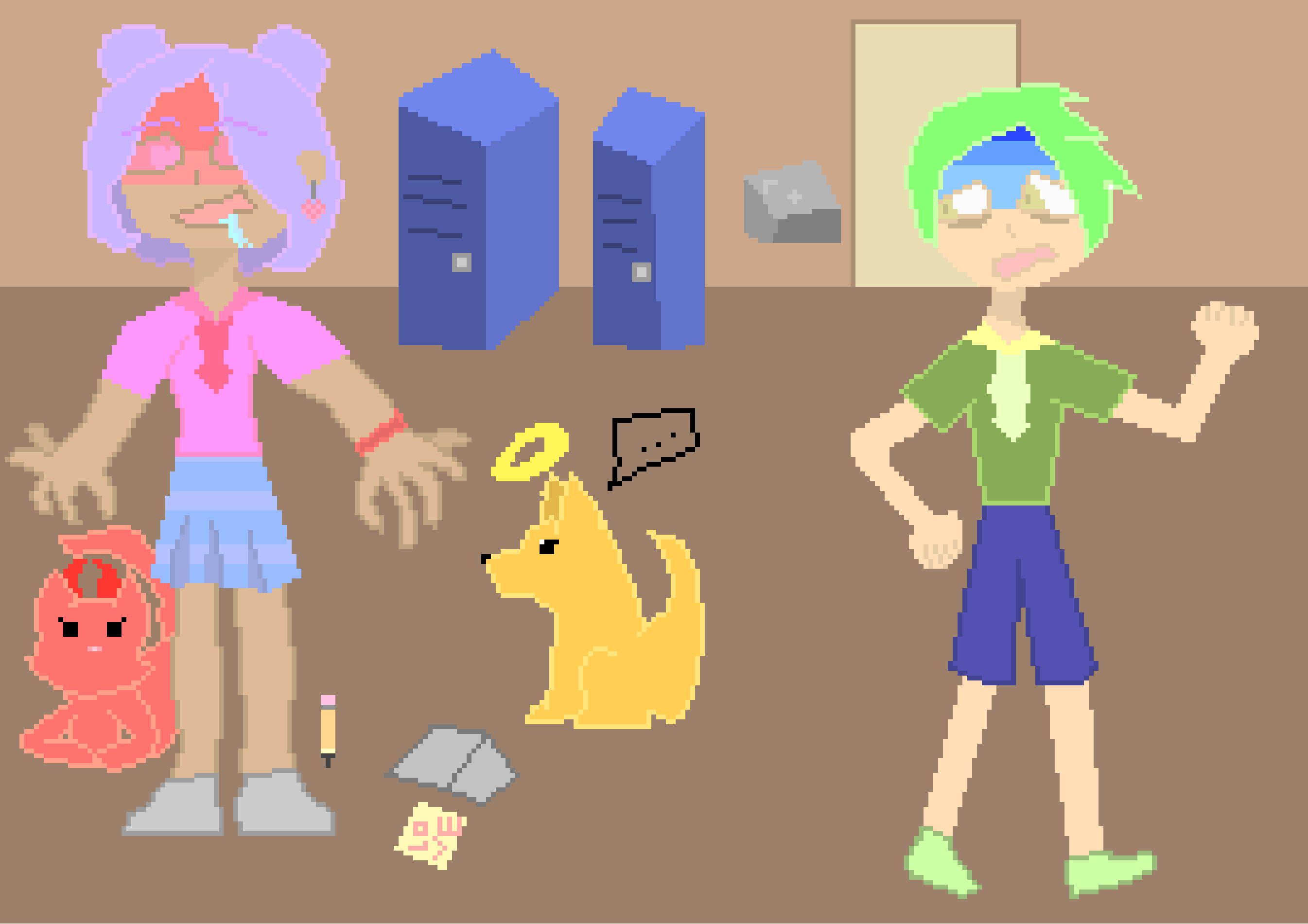 I believe she has a "Senpai" if I am correct? She is kinda crazy but loves her cats and dogs. So that's why there are so many around her. Those are her two wisdom animals, she kinda has a problem. Tabs is the cat, she is laid back and chill. She is also the one who causes a bit of trouble, she is seen more often. King is the one who can control her, in big situations, he is the one trying to be in charge-