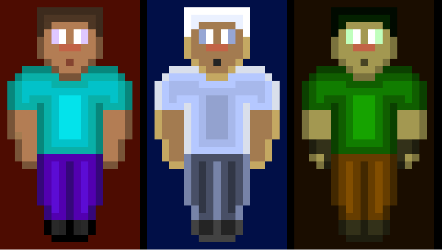 So I have created 3 specific Herobrines. FYI Herobrine is a creepy, satanic character in the game, Minecraft, and he basically haunts you and kills you. Anyway, the 1st one (in the left corner) of the real drawing of Herobrine. People say that he lives in the demension called The Nether, which is basically Hell or The Underworld. The 2nd one (in the middle) is Icy herobrine, and the 3rd one (in the right corner) is Foresty Herobrine. I hope you like my artwork :D