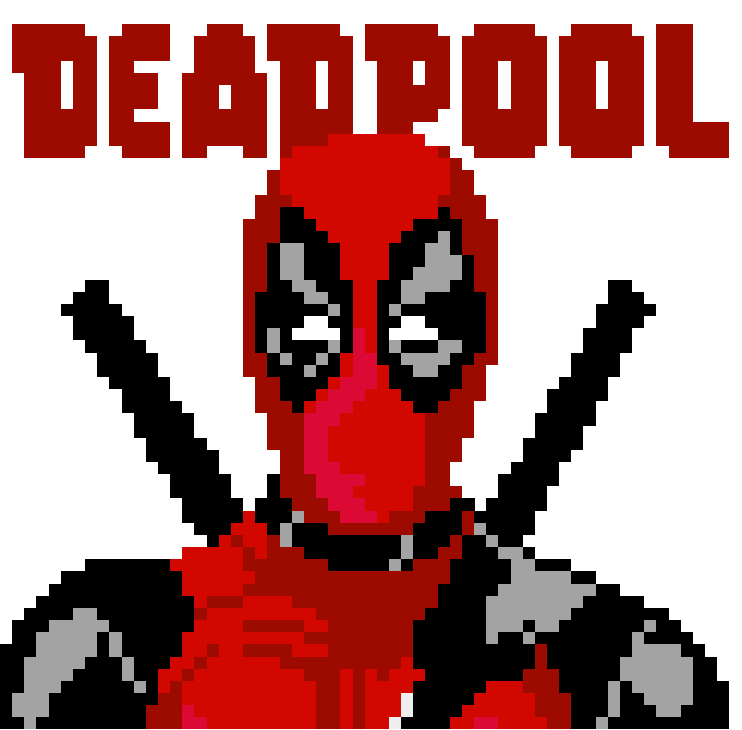 This pixel art is a picture of Deadpool with the word "Deadpool" above him.