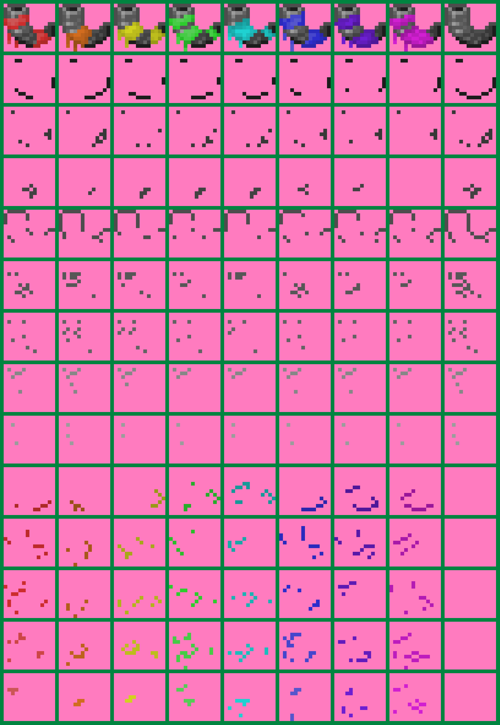 Each column represents a goat horn, going from red to magenta in the traditional rainbow (going left to right), each with a unique cloth design, going from left to right in the order you revealed them in. That way each goat horn has a unique color and cloth design. Row 1 shows the original/full art. Each row after this one represents a different color used in the art for the goat horn at the top of their respective column. Individual colors are extracted from the full art and put into the spaces below with the exact placement relative to said original art. Rows 2-8 show the default goat horn colors, going from darkest to lightest. Rows 9-13 show the colors added by the cloth, also going from darkest to lightest. These ones all have different colors since the color of the cloth is different for each one. Since the last column shows the in-game goat horn design, it doesn't have a cloth on it and does not have anything from rows 9-13.
