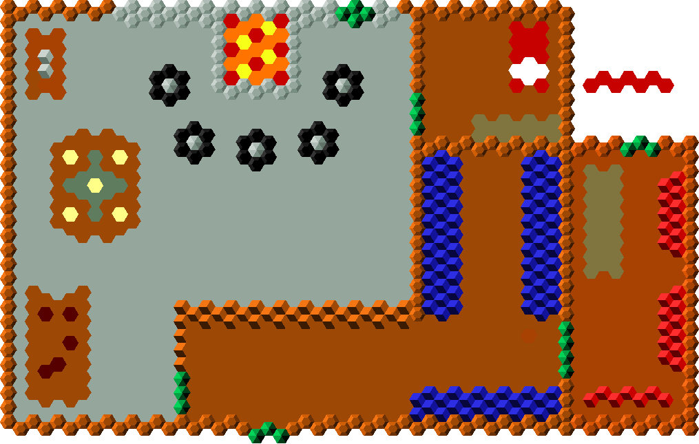 The Following is a Forge. Weapon Racks are blue, Entrances are green, the Bed is Red, The forge, you can tell, and tables are flat brown. (copy)
